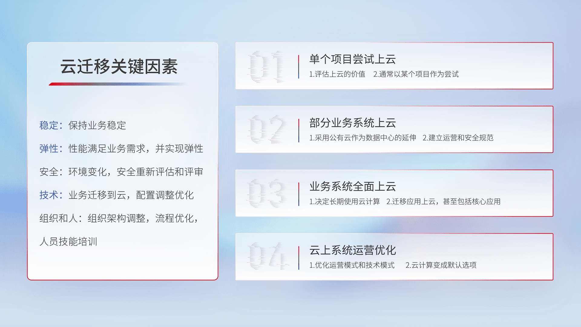 结合实际业务,,,,从规划设计、、、云平台选型、、、云原生改造、、、、数据迁移、、集成交付,,迁移全过程为客户识别最佳上云路径,,做好风险识别管理,,设计网络架构、、、身份权限、、、安全审计合规、、、、操作审计、、、、日志审计、、、、监控告警策略、、、多站点容灾设计等,,对云上基础设施进行整体规划,,,提升IT治理水平,,,以满足弹性、、、高可用、、高性能的需求。。