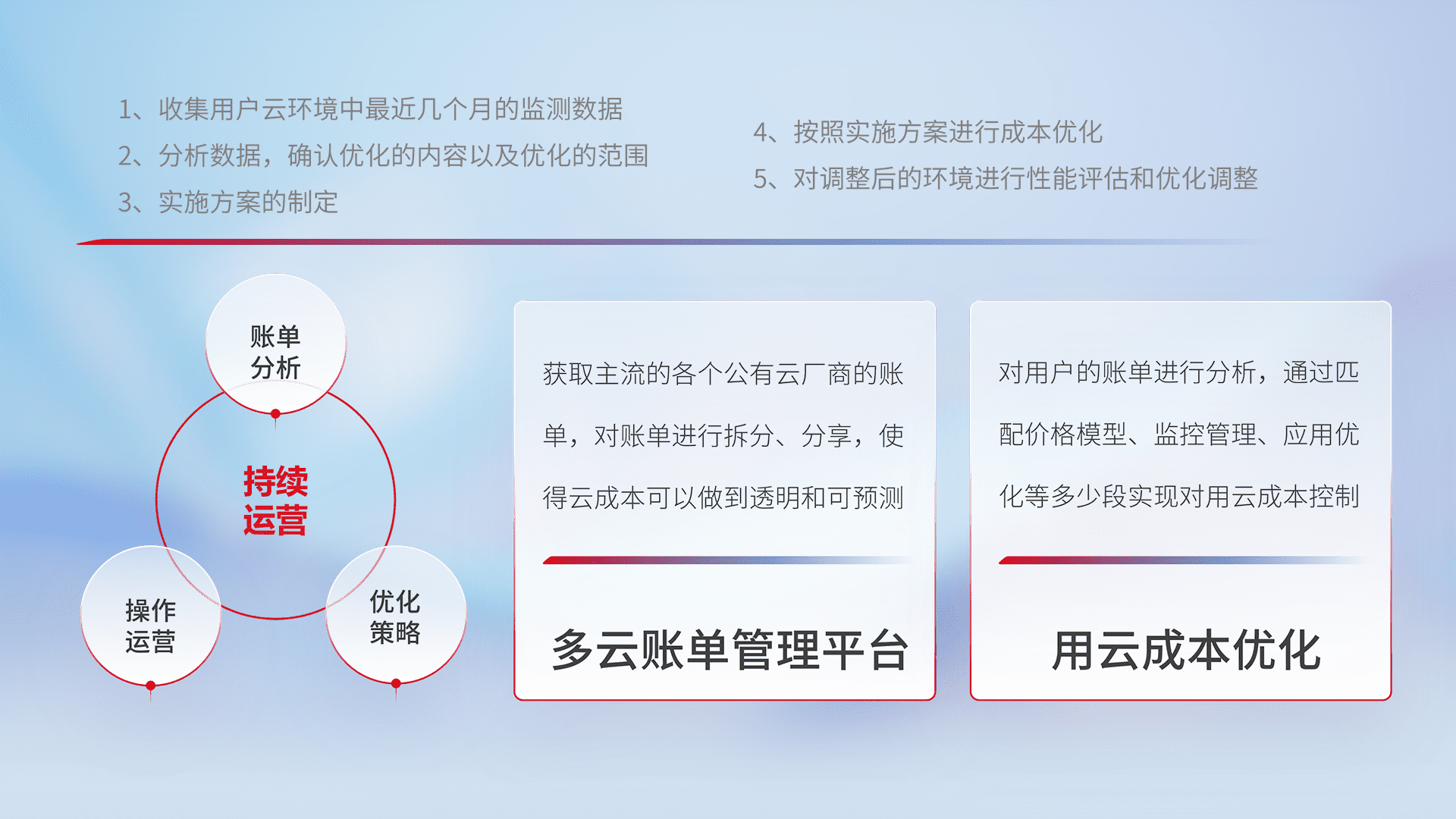 通过多云纳管,,,以统一的资源数据模型把客户的云资源进行抽象和封装,,,,进而实现对多云资源的统一操作,,,保障云资源管理的可靠性、、稳定性与可用性。。量身定制化运维内容,,,配置、、开发运维、、、补丁管理、、备份、、监控、、、认证和访问管理、、审计和日常巡检等,,,,保障在用云过程中的可靠度,,稳定度以及高可用率。。。