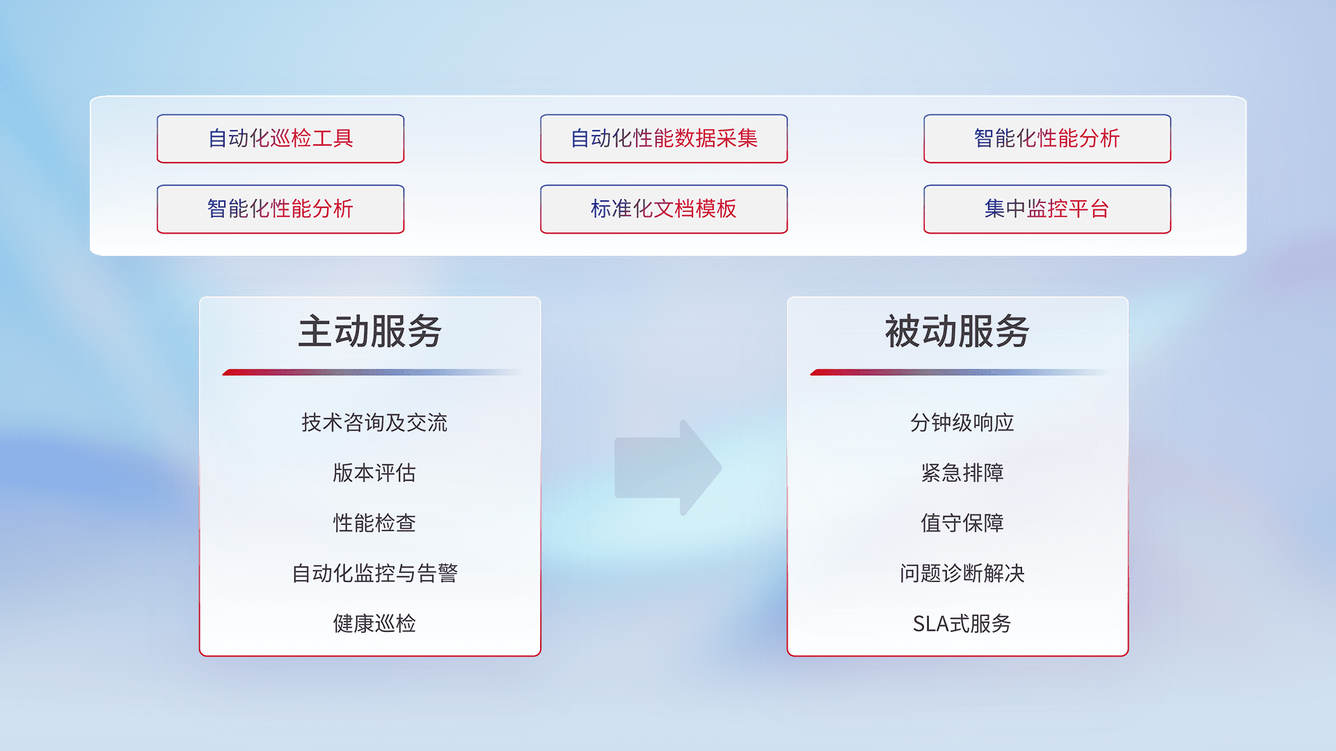 智能化工具和标准化文档,,保障服务质量,,,,提供主动服务(包含技术咨询、、版本评估、、、、性能检查、、自动化监控与告警、、健康巡检)和被动服务包含(分钟级响应、、紧急排障、、、值守保障、、问题诊断解决、、、、SLA服务)。。