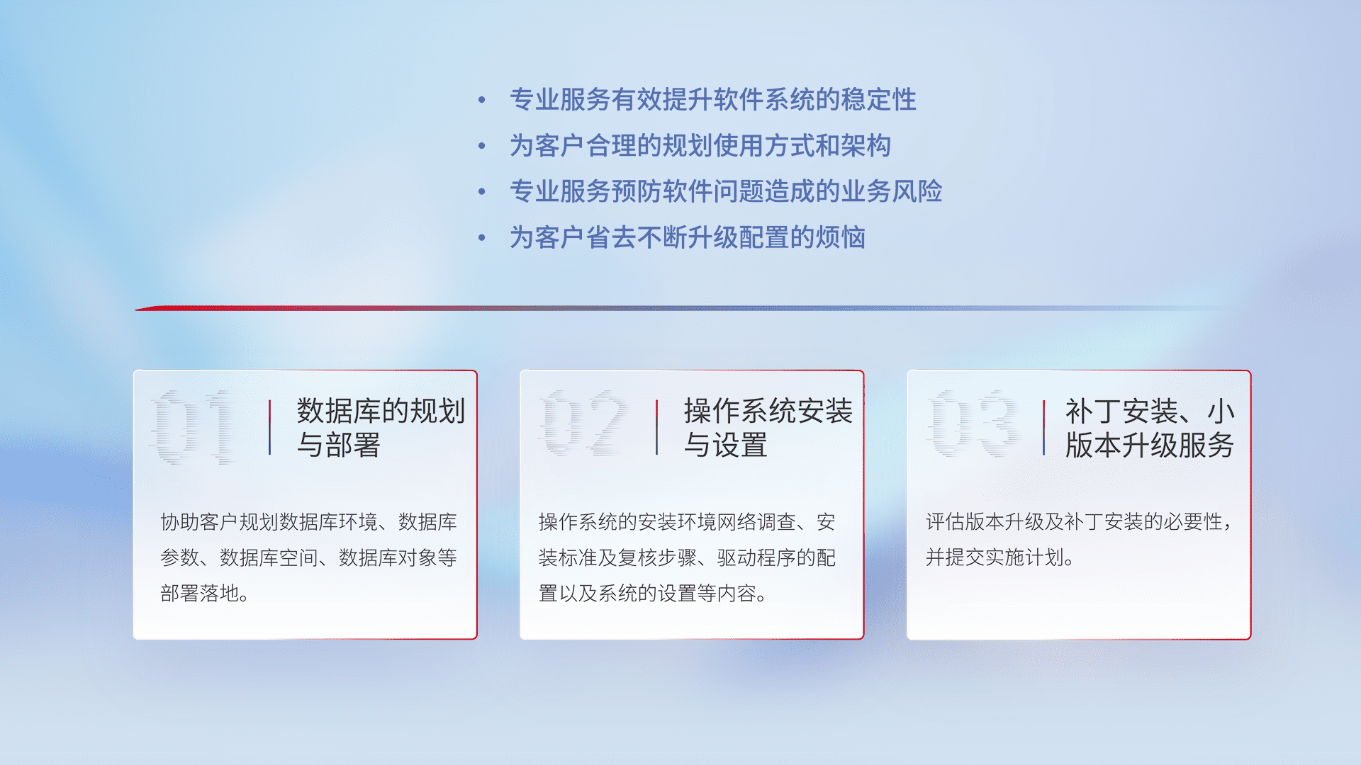 为客户提供软件规模升级、、、、快速部署、、、按需配置的专业服务,,,从数据库的规划与部署到操作系统的安装与设置,,再到补丁安装和小版本升级提供支持。。